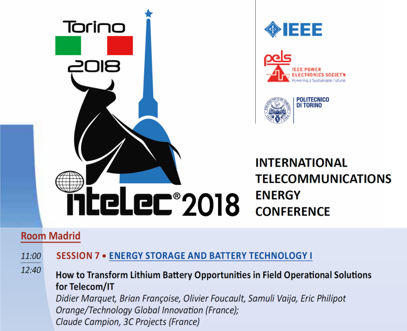 3C Projects a contribué à la rédaction de la publication intitulée "How to transform Lithium Battery Opportunities in Field Operational Solutions for Telecom/IT" avec Didier Marquet, Brian Françoise, Olivier Foucault, Samuli Vaiga et Eric Philipot d'Orange / Technology Global Innovation (France). Didier Marquet d'Orange a présenté le document à Intelec 2018 à Turin; Les participants ont apprécié la qualité de la présentation et Didier Marquet a pu répondre aux différentes questions appropriées. (voir)